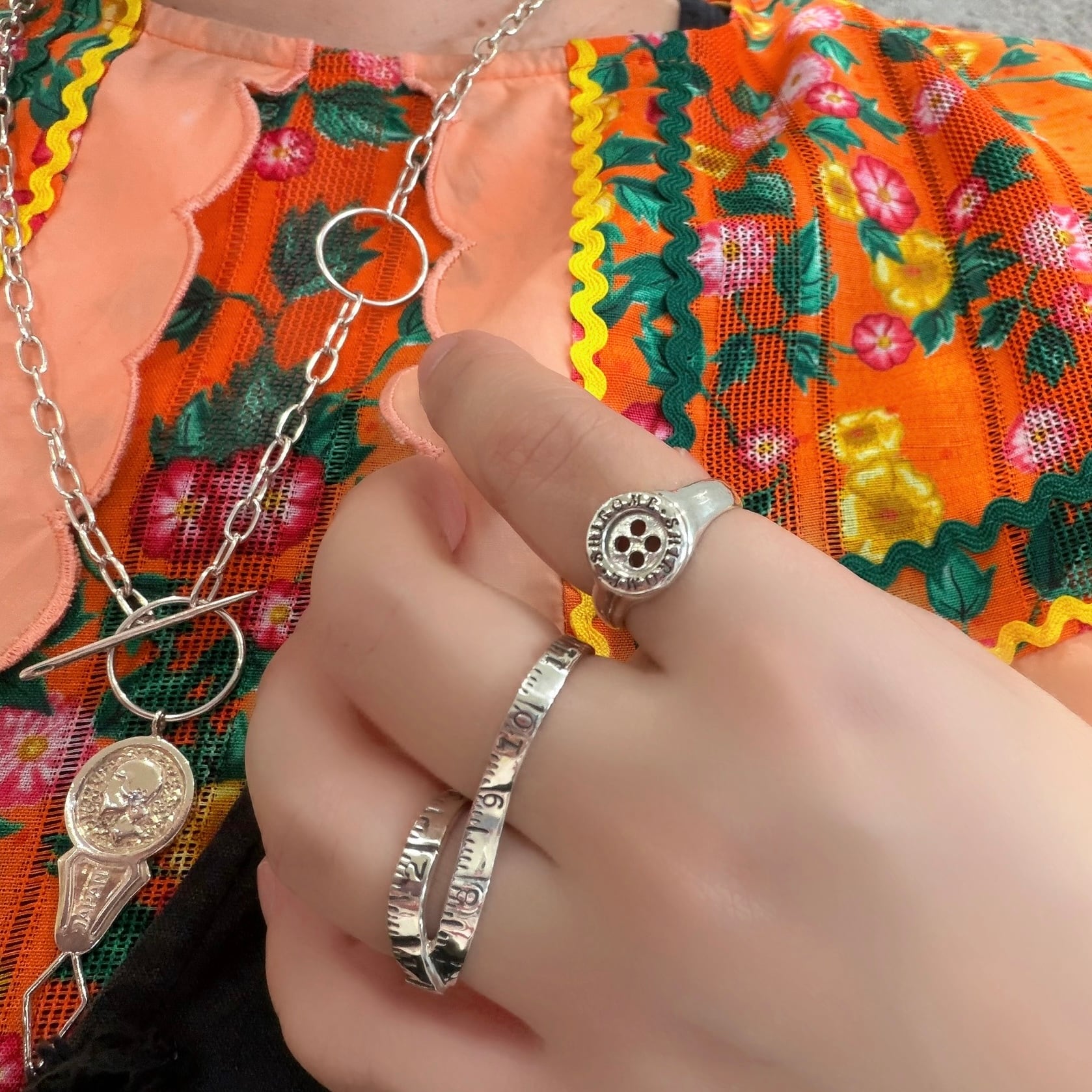 クラシカルなシグネットリングのフォルムに[ぼたん]を組み込んだ遊び心と裁縫愛を感じるデザイン。